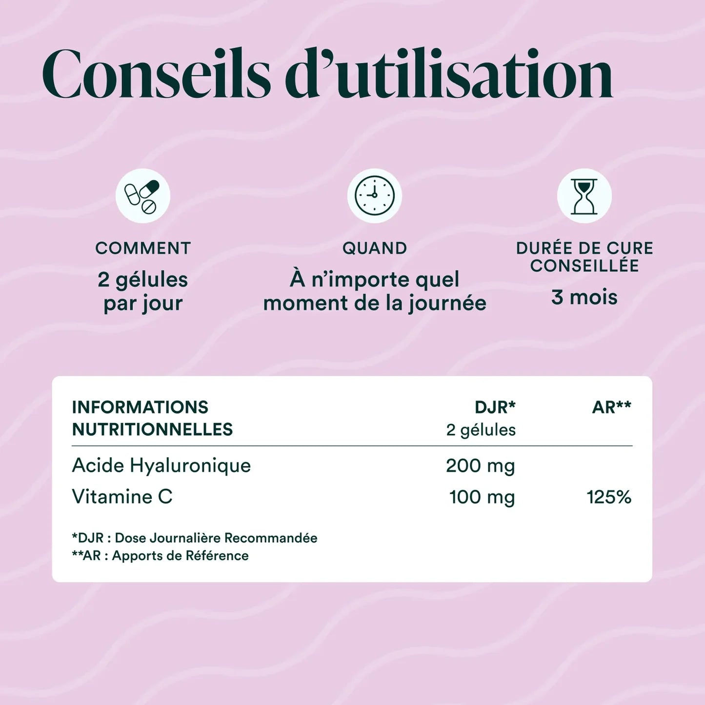 Notre formule beauté est bien plus qu'un simple complément de collagène. C'est une combinaison innovante de 7 actifs à l'action ciblée sur la peau, les cheveux et les ongles ! Elle apporte 1000 mg d'hydrolysat de collagène marin pur de type I et III de qualité Naticol® extrait de poissons sauvages issus de zones de pêches durables. Pour des effets optimaux, notre formule contient en supplément une combinaison d'actifs anti-âge : de la vitamine C, de la vitamine E et du bisglycinate de zinc. Elle est également renforcée par l'acide hyaluronique, la vitamine B6 et la biotine. Notre formule beauté aide à retrouver une peau nette, limite les imperfections, favorise la beauté des cheveux et améliore la solidité des ongles. En somme, du bien-être intérieur qui se reflète à l'extérieur !