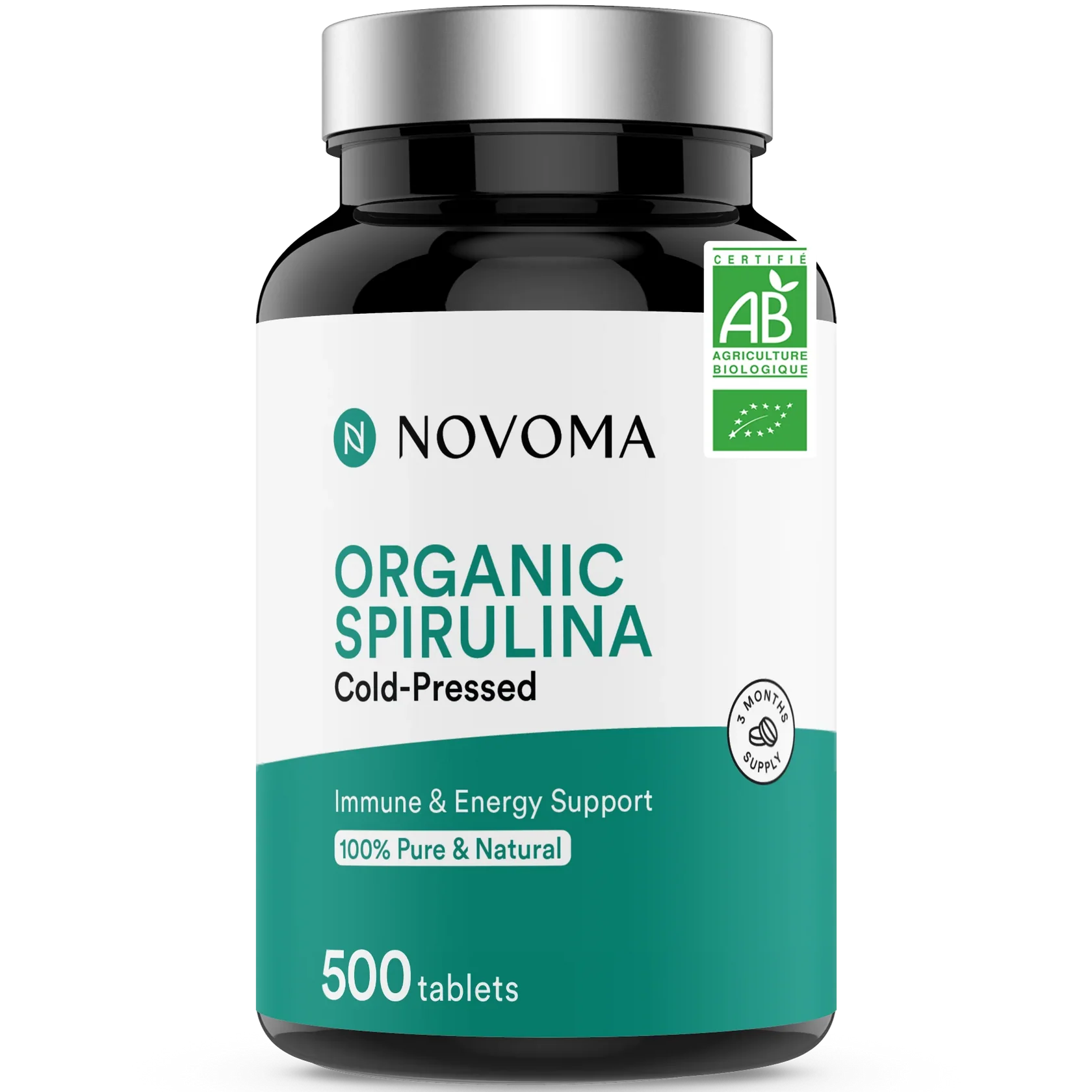 Notre spiruline bio est 100% pure et naturelle, et se présente sous forme de comprimés de 500 mg faciles à avaler.